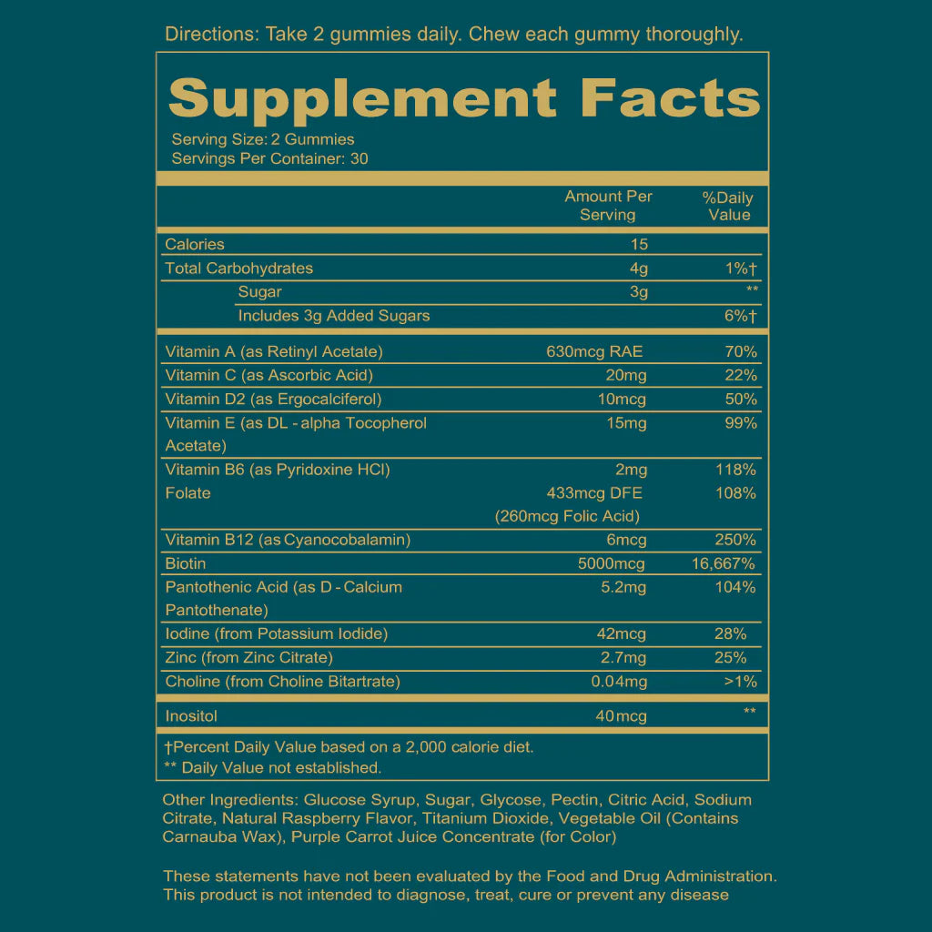 Our formula combines essential vitamins and nutrients such as Biotin, Folic Acid, Vitamin B5, B6, C, and E — carefully selected to support healthy hair, skin, and nails. Each ingredient is science-backed, dermatologically tested, and free from parabens or harsh sulfates.